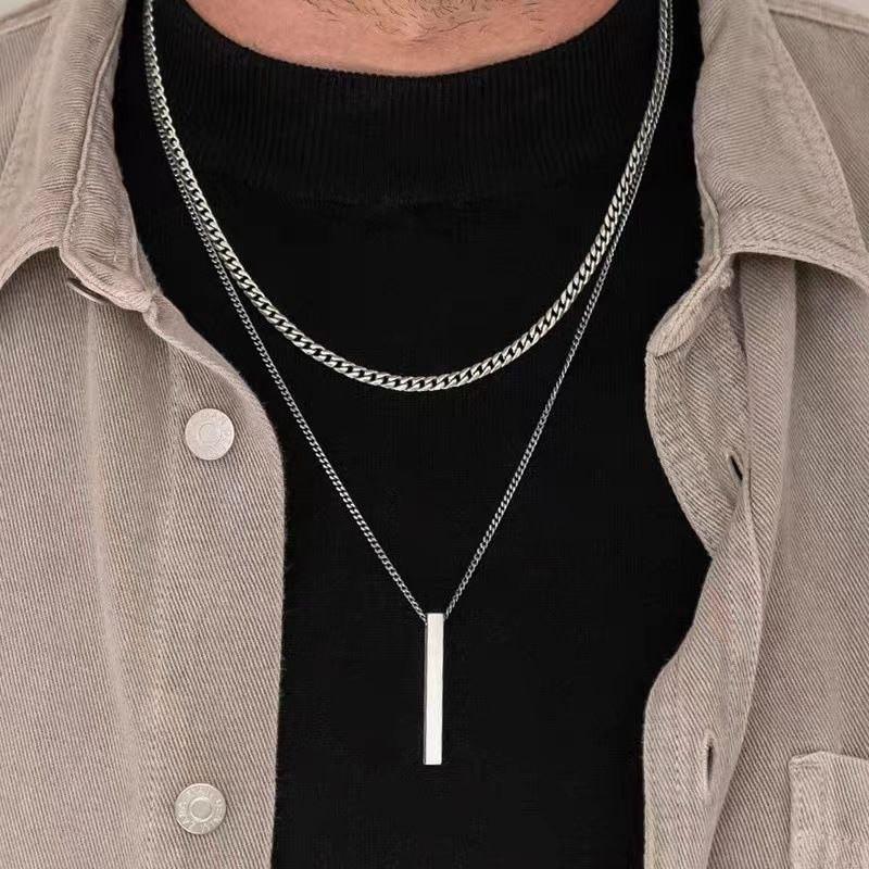 Acier Titane Collier long double couche en acier inoxydable pour hommes et femmes, pendentif pour couples simple, style hip-hop et disco